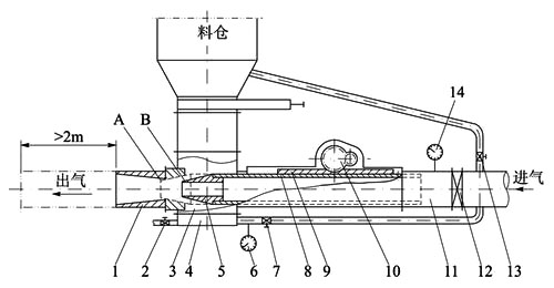 結構包括:1.擴散管;2.清灰閥;3.泵體;4.下進氣箱;5.風嘴;6.壓力表;7.進氣閥;8.噴射管;9.齒條;10.調整裝置;11.進氣接管;12.止回閥。
